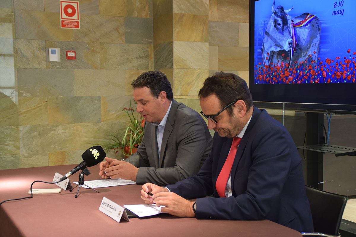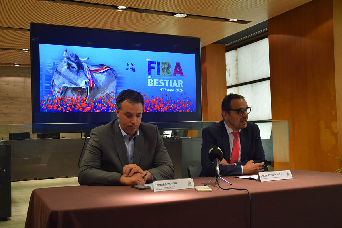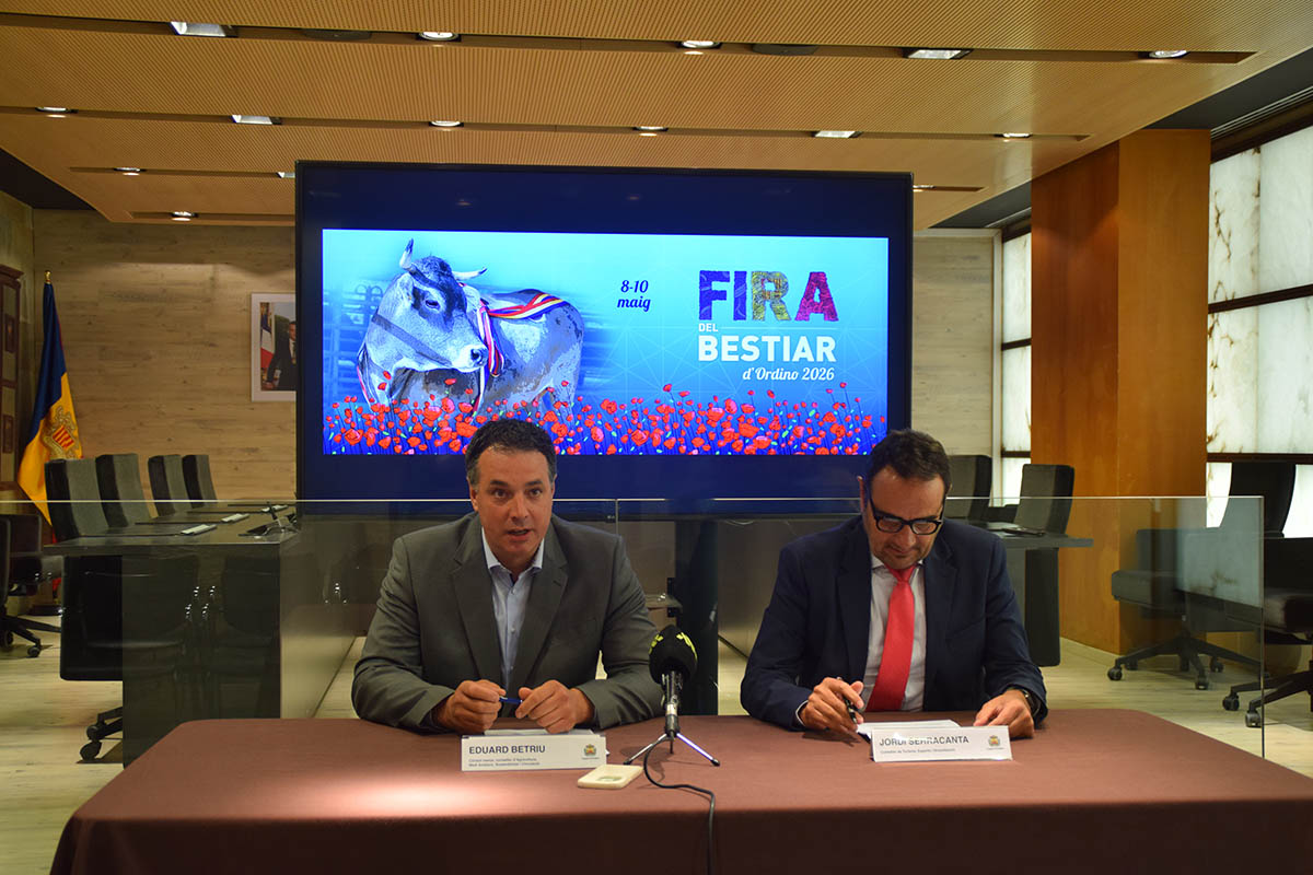 El cònsol menor d'Ordino, Eduard Betriu, i el conseller de Turisme, Dinamització i Esports, Jordi Serracanta, durant la presentació de la Fira del Bestiar.