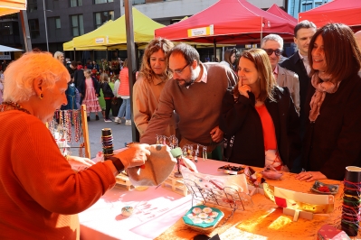 La cònsol major d'Escaldes-Engordany, Rosa Gili, i l'equip comunal visitant les parades de la plaça Coprínceps.